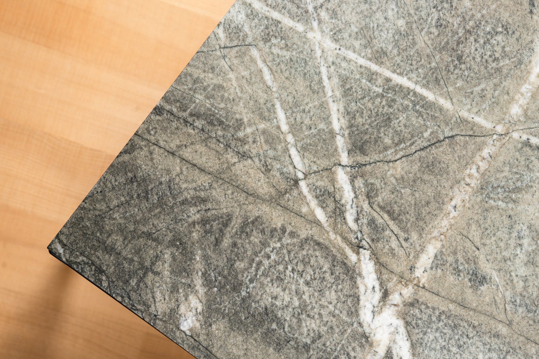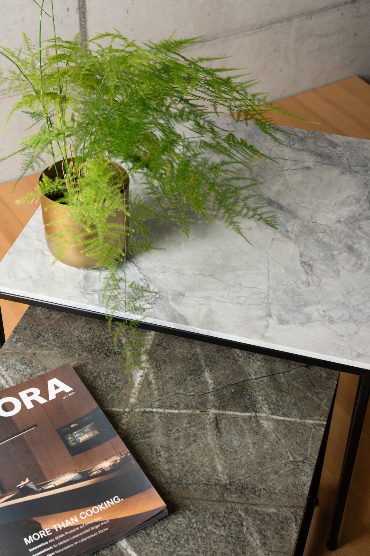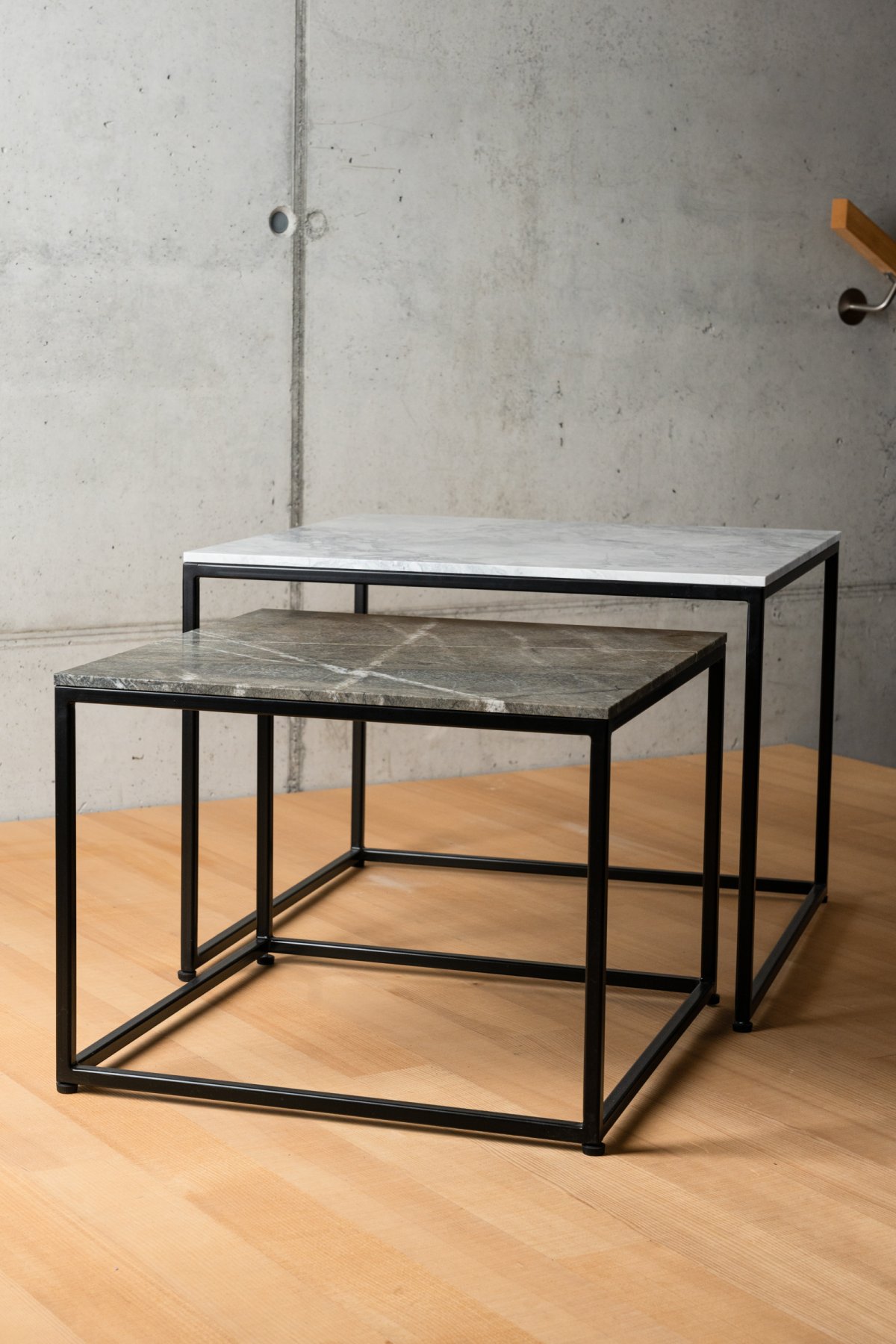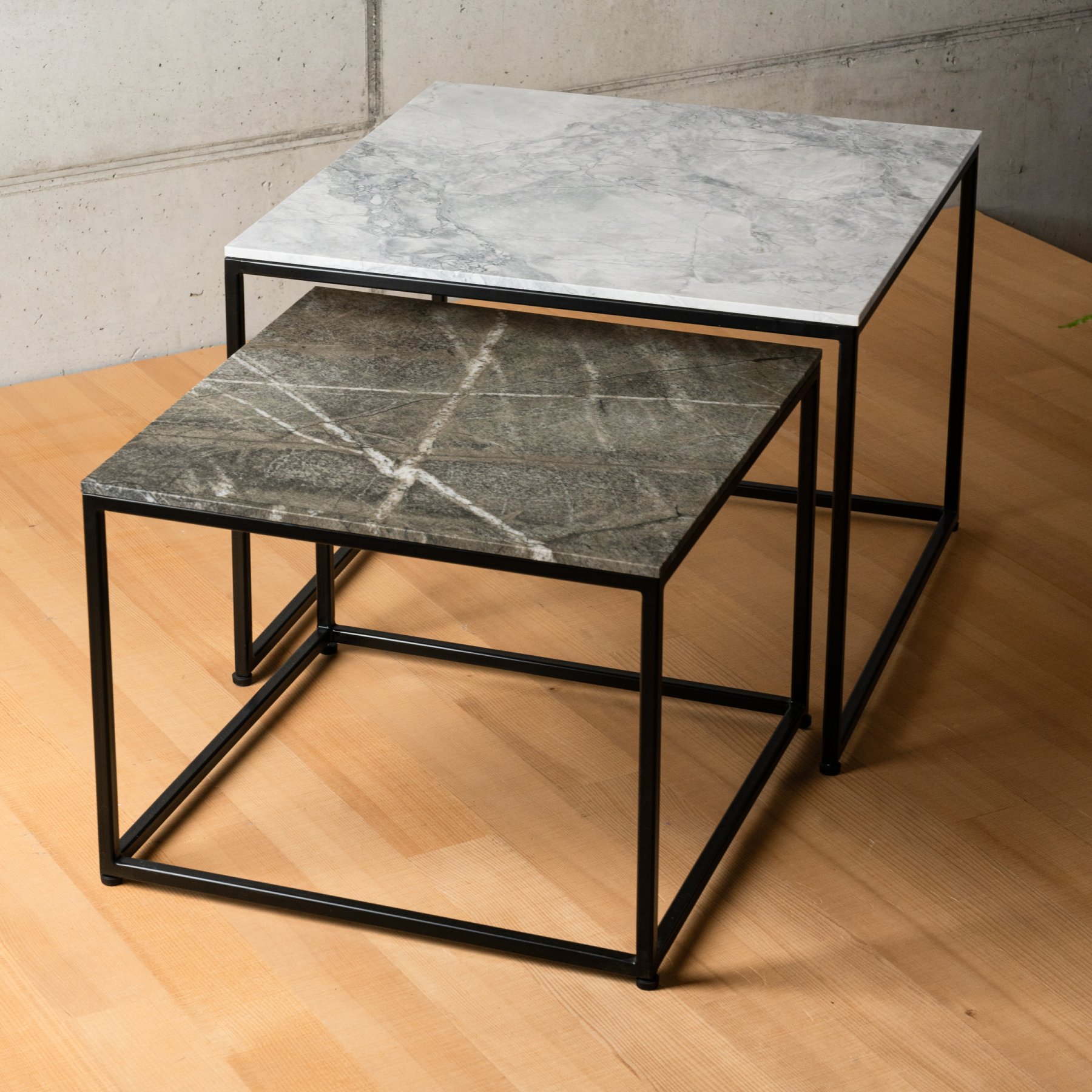 Ob einzeln oder als Set – Tavon passt sich an. Zwei quadratische Beistelltische aus edlem Naturstein und filigranem Stahlgestell. Schlicht, markant und vielseitig kombinierbar.
